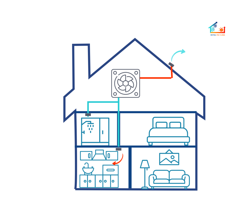 Il circule ensuite dans le logement, notamment sous les portes, avant d’être évacué une fois chargé en humidité et en polluants grâce aux bouches d’extraction.